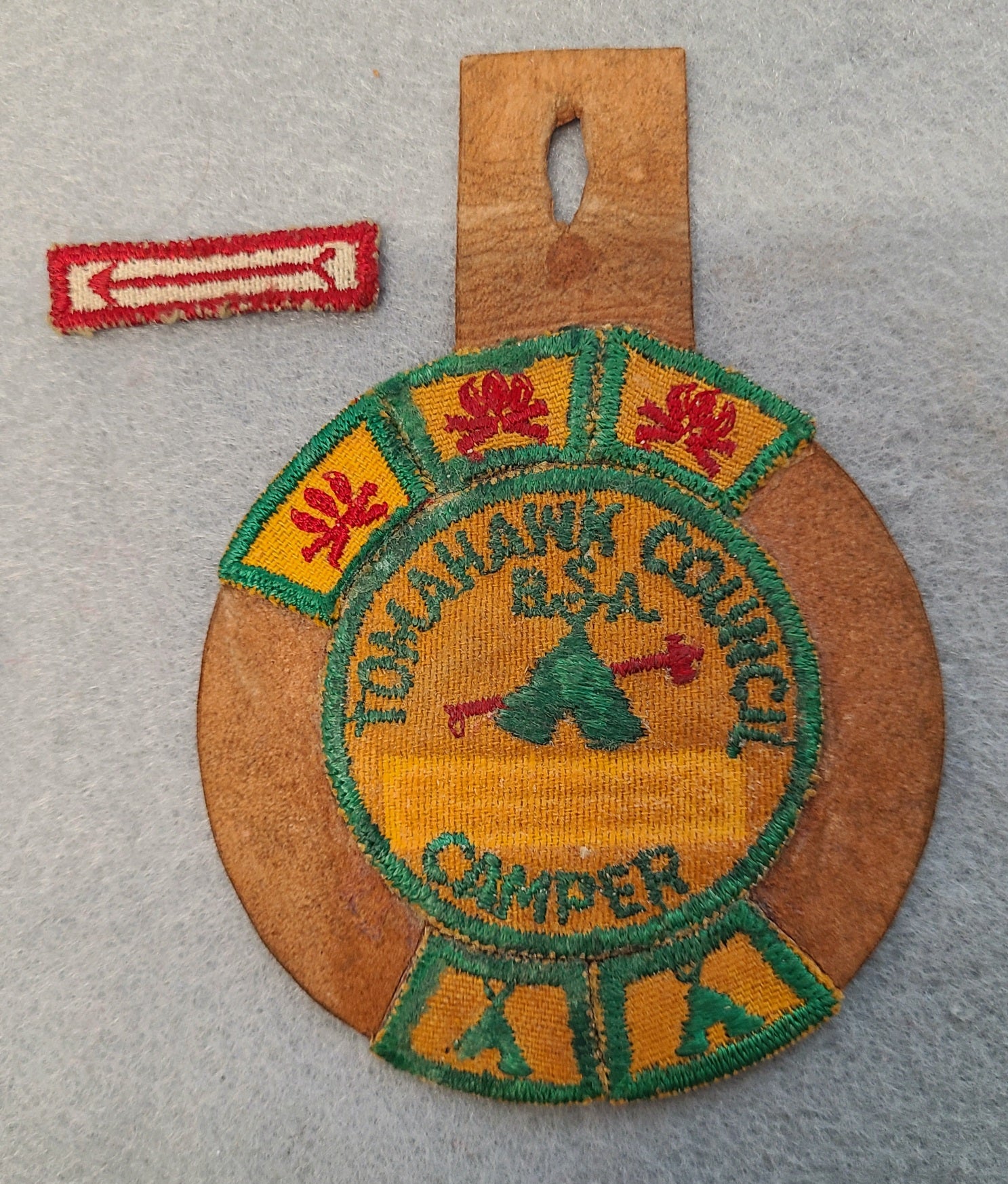 WITH 5 OTHER SEGMENTS THAT ARE GLUED TO LEATHER POCKET PATCH. THE LODGE RED ARROW SEGMENT FELL OFF, BUT THE AREA WHERE IT HAD BEEN GLUED ON THE CAMPER PATCH FOR MANY YEARS CAN BE SEEN(PIC 2). LODGE MERGED IN 1956. VERY RARE