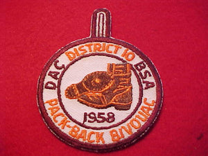 1958, DETROIT AREA C., DISTRICT 10 PACK-BACK BIVOUAC, GLUE ON BACK