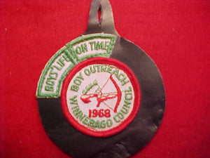 1968 WINNEBAGO C. BOY OUTREACH PATCH & BOYS' LIFE + ON TIME SEGMENTS, ON LEATHER, USED